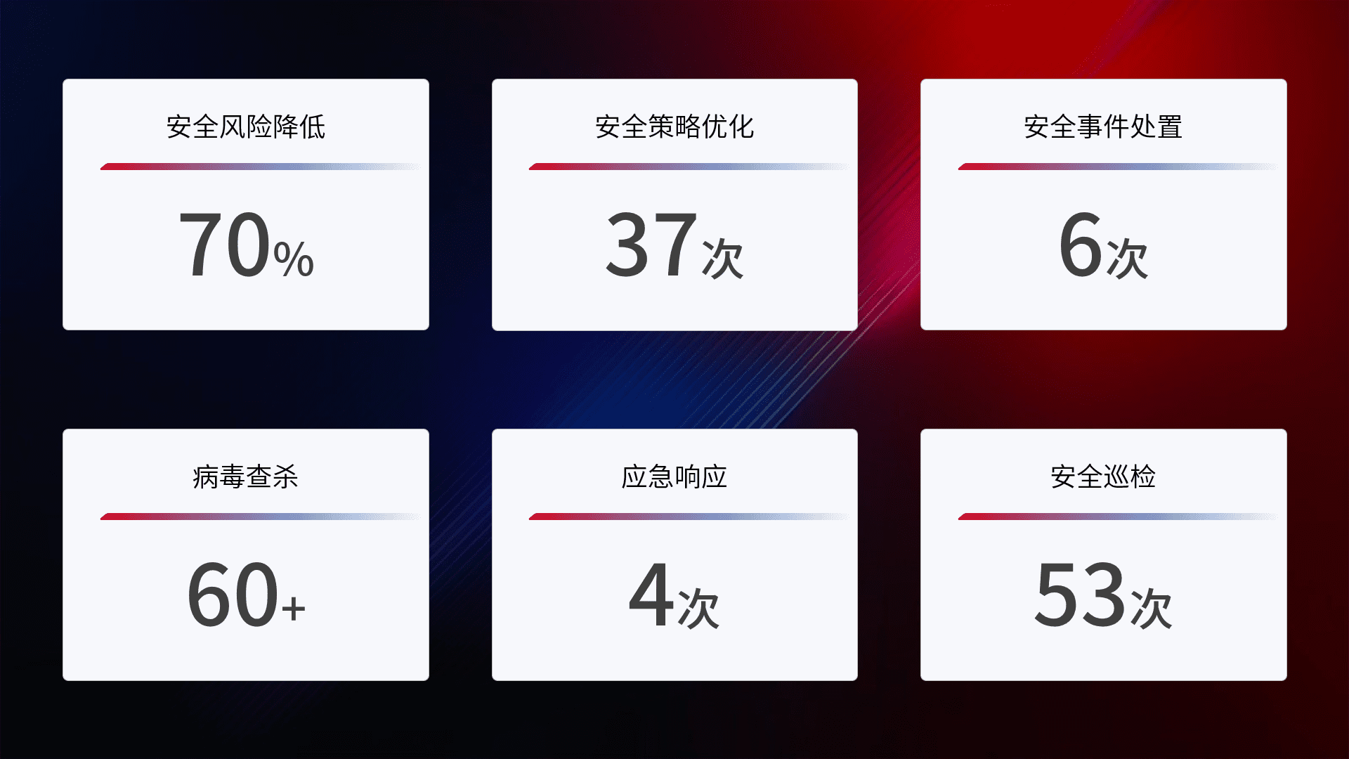 提供全面的安全事件报告体系,,包括处置报告、、周报、、、、季度和年度总结,,结合持续监控,,,,帮助客户深入了解网络安全状况。。。