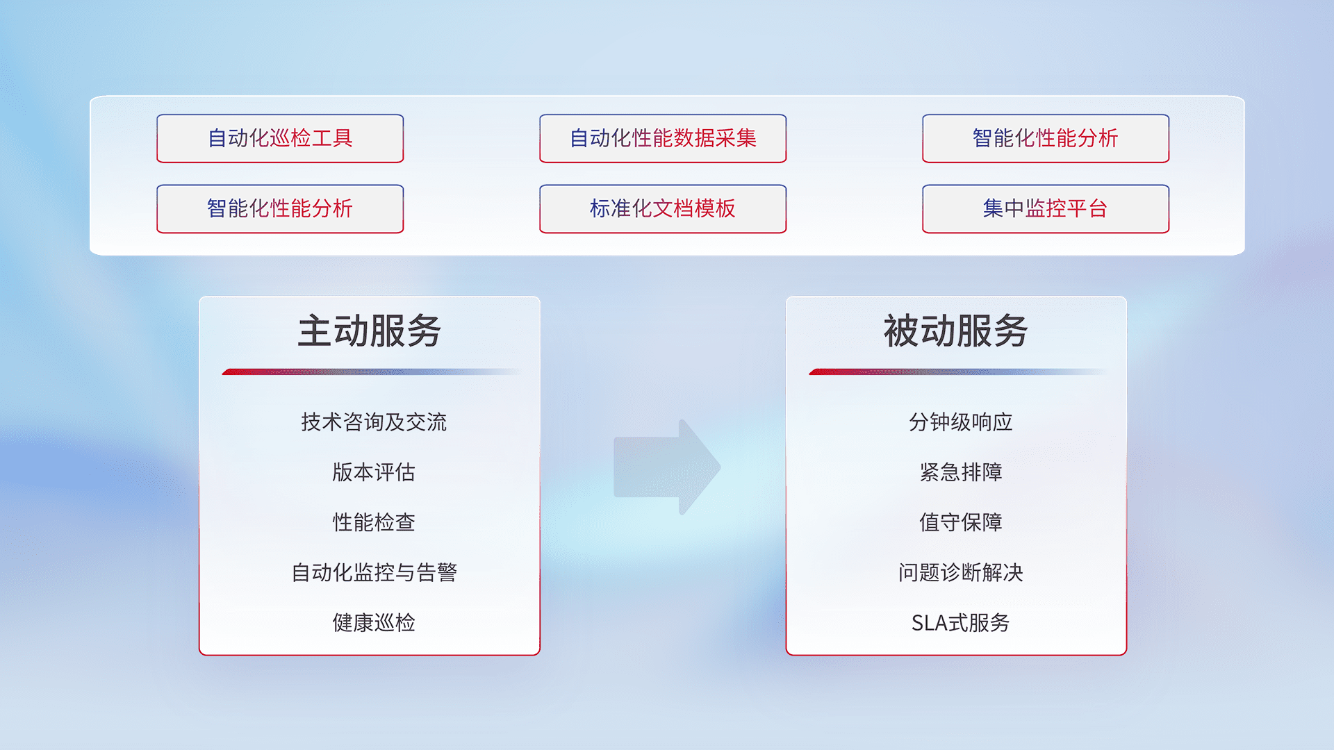 智能化工具和标准化文档,,,保障服务质量,,,,提供主动服务(包含技术咨询、、版本评估、、性能检查、、自动化监控与告警、、健康巡检)和被动服务包含(分钟级响应、、紧急排障、、、、值守保障、、、、问题诊断解决、、、SLA服务)。。。。